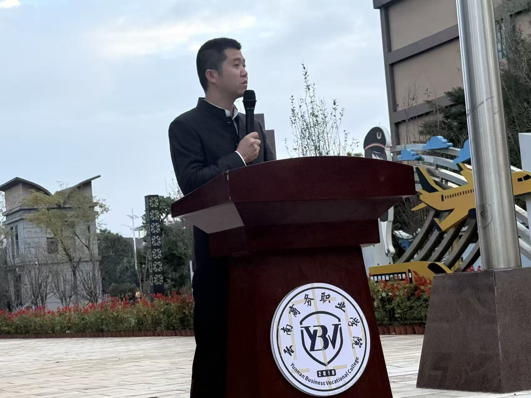 随后,学生代表陈蝶同学进行国旗下演讲。她以“青春逢盛世,奋斗正当时”为主题,结合自身学习与生活经历,分享了对爱国精神与青年责任的理解。陈蝶同学表示,作为新时代青年学子,生逢和平与发展的好时代,更应肩负起传承红色基因、建设强国的使命,在校园中以勤奋为笔、以理想为墨,认真学好专业知识,积极参与实践活动,团结互助、共同进步,让爱国情怀在日常学习生活中落地生根,努力成长为能为国家、为社会贡献力量的新时代电商人才。她的演讲真挚动人,引发了在场师生的强烈共鸣。